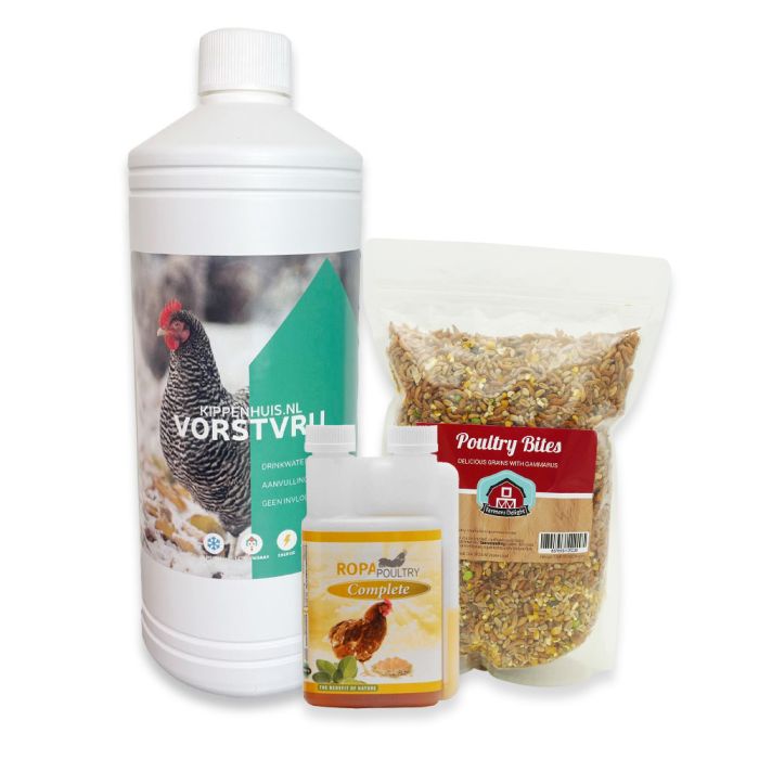 Het Vorstvrijpakket, bestaand uit Vorstvrij, RopaPoultry Complete 100ml en Poultry Bites, maakt samen een ideaal winterpakket. Het Vorstvrij zorgt er voor dat het drinkwater van jouw kippen ijsvrij blijft en dus niet bevriest. Daarnaast zorgt de RopaPoultry voor een goede preventieve bescherming van onder andere darmklachten voor je kippen. De Poultry Bites is een heerlijk strooivoer te gebruiken als tussendoortje voor jouw pluimvee! De granen stimuleren een goede gezondheid voor je kippen!